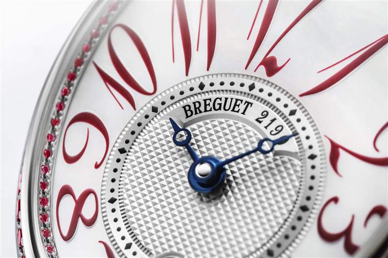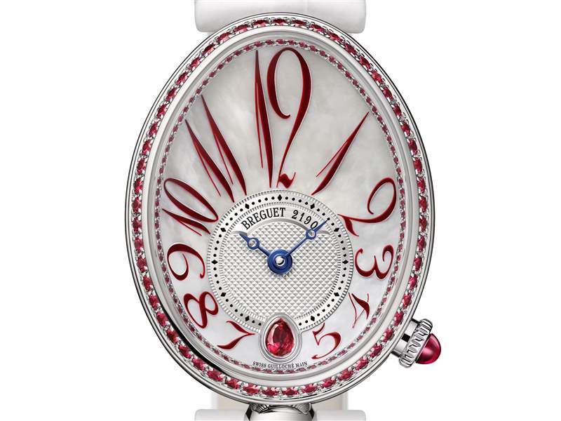 新作以紅寶石取代 Reine De Naples 系列的鉆石鑲嵌——超過100顆紅寶石勾勒出鵝蛋形表殼的圓潤輪廓,突出白金表圈的纖細(xì)構(gòu)造。溫婉的白色珍珠母貝表盤搭配酒紅色時標(biāo),偏心式時分盤裝飾精致的璣鏤雕紋,賦予腕表幾分微妙的古典氣息,6點鑲嵌一顆水滴形切割紅寶石成為點睛焦點。