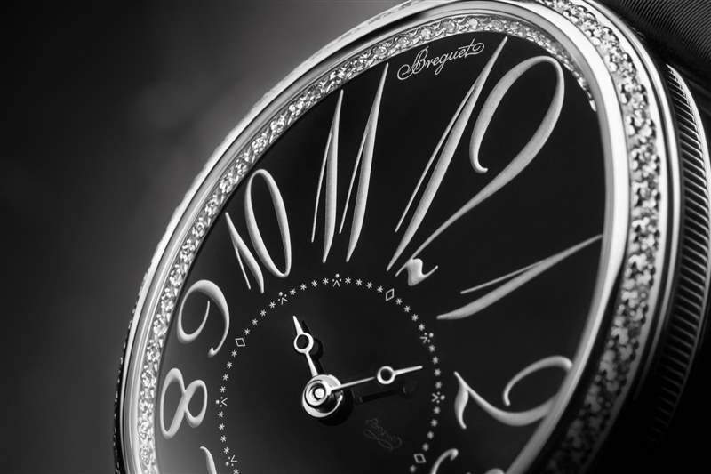 黑色大明火琺瑯表盤經過800°高溫多次燒制,呈現均勻而深邃的純黑色調。阿拉伯數字時標涂飾銀粉提供出色的閱讀性,手寫體曲線優雅流暢。簡約的雙針表盤采用偏心式布局,Breguet 秘密簽名隱藏于3點,6點位置鑲嵌一顆梨形切割鉆石成為點睛。
