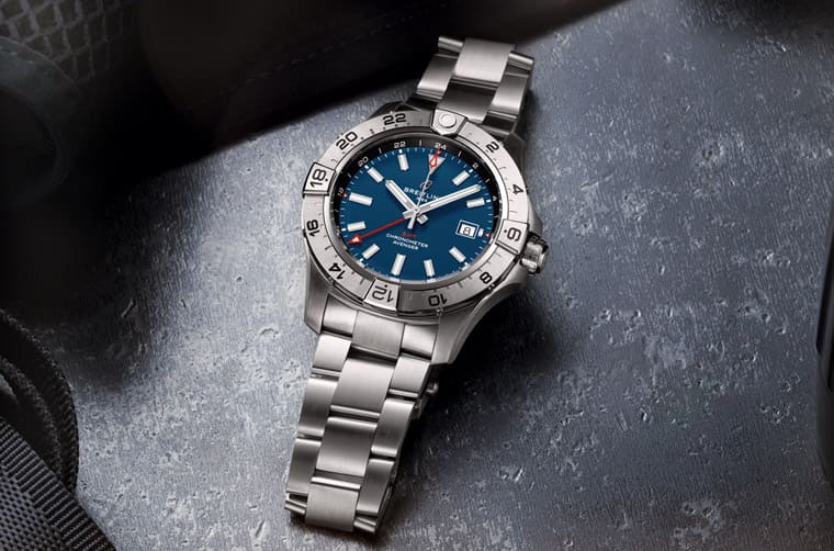 與計(jì)時碼表同尺寸的尚有世界時區(qū)自動表,表款同樣以不銹鋼制成,外觀線條與計(jì)時碼表大同小異,比較明顯的不同即在于沒有計(jì)時按把,同時百年靈也因應(yīng)手表的定位與功能性,將表圈上的刻度從60分鐘改為24小時,另外面盤外緣還有另一圈24小時刻度,搭配GMT指針能衍生出第三地時間功用。這款表分別有黑色或海軍藍(lán)兩種面盤配色,其GMT指針以及秒針著針尖都涂上紅色,在深色面盤背景上看起來特別清楚。手表搭載B32機(jī)芯,它的功能在現(xiàn)代跨國移動頻繁的情況下格外實(shí)用,不過動力儲存42小時不算特別出色,幸好機(jī)芯為自動上鏈系統(tǒng),隨著佩戴者日?;顒幽艹掷m(xù)替機(jī)芯補(bǔ)充動能。