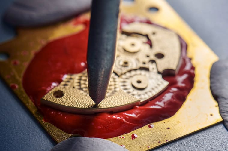 FC-980機芯的零件講究地以手工完成,康斯登旗下有兩位資深制表師專門負責(zé)這款機芯的制作與組裝,他們在制作過程中會用用卡布倫銼刀替零件進行倒角處理、用錘子和針進行敲擊形成機芯夾板的不規(guī)則紋路,并在機芯底板、陀飛輪框架底部橋板與夾板上使用僅9μm的砂紙,磨制出狀似隕石面盤的交錯紋路。包括固定螺絲外表也以金剛砂進行拋光,細心處理后的螺絲在不同角度受到光線照射下,能呈現(xiàn)從鋼色到黑色的漸變光澤,每一枚FC-980機芯的正反側(cè)會有40顆螺絲,每一顆都需要至少40分鐘的修飾才能完工,因此整枚機芯的修飾會需要花上數(shù)周時間,制作難度由此可見一斑。