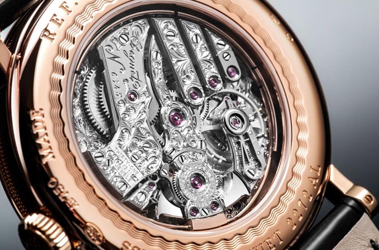 表背重頭戲就是手表搭載的567/2手上鏈機芯,雖然它的正面相對優雅樸實,可是寶璣針對這枚機芯下的功夫沒有因此而減少,于是我們可以看到機芯的底板上充滿了手工制作的雕刻花紋,包括擺輪橋板的狹小空間一樣有雕花裝飾,加上夾板上也有魚鱗紋打磨,光用看的就可以感受到寶璣制作這枚機芯花費許多時間和精神。 機芯背面還能欣賞到三問報時組件如音錘與音簧,前者以不銹鋼制成并經過黑色拋光處理,后者則是用K金材質制作,目的是與表殼材質產生更佳的傳聲與共鳴效果,藉以奏鳴出清澈響亮的報時樂音。 機芯的擺輪震頻為2.5Hz,動力儲存為40小時,這方面就顯得較具古典味,但是就手表擁有的功能性、機芯的觀賞性等層面而言,實在也很難要求它更多了。