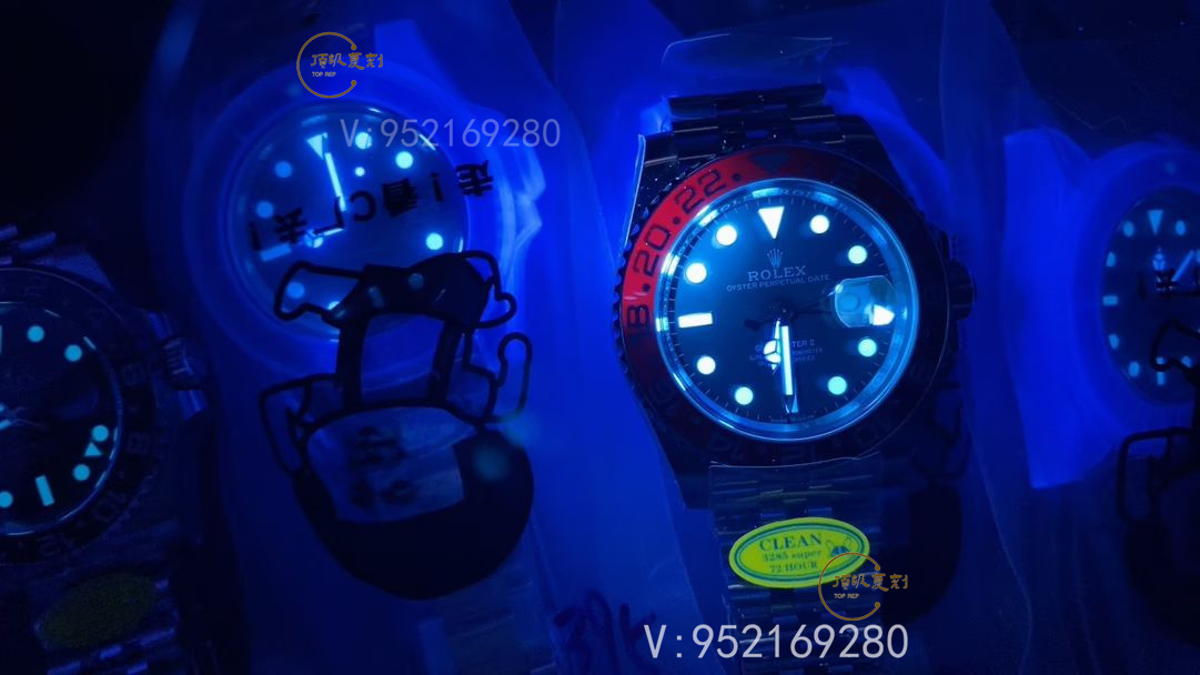 C廠V3版本最突出的就是圈口上的升級,紫光燈照射的藍色部分,圈口會變得更加透亮,做的是非常非常的好,我們看一下這個紅藍連接的部分,這個顏色做的也是非常好的,V3的圈口是對的,當然升級圈口的也不止C廠一家,還有C+廠也是用的這個一模一樣的圈口,不過C+廠用的是上海的3285機芯,它的動儲只有40個小時,沒有C廠的丹東機芯動儲那么高。