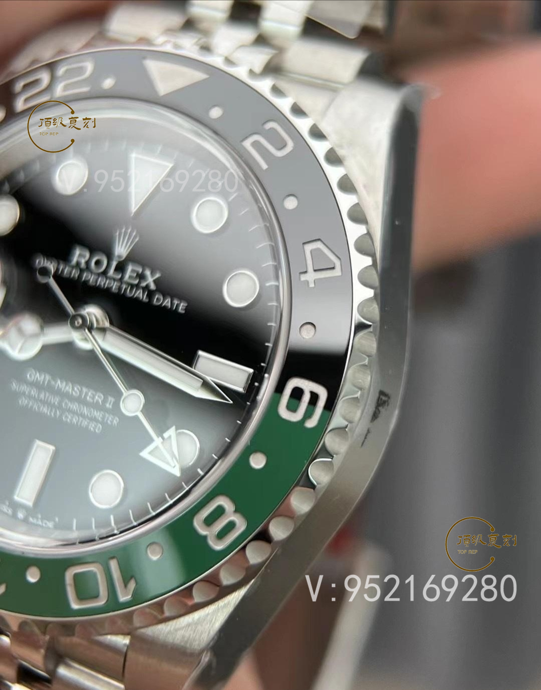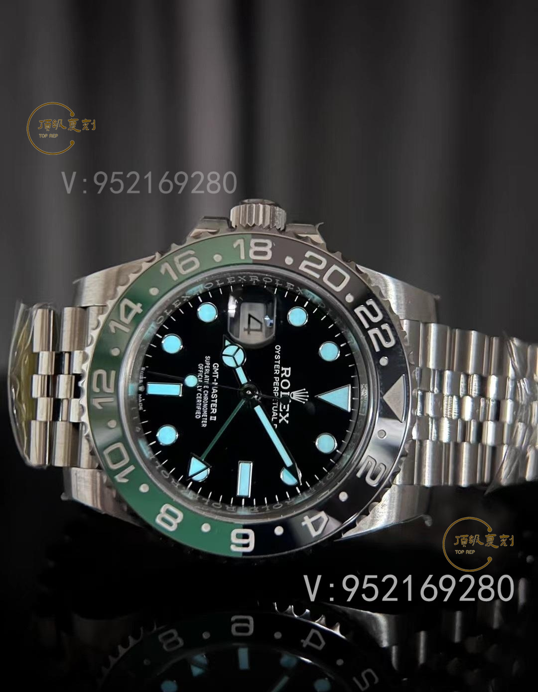 C廠雪碧圈陶瓷圈外圈上面是這種黑色的,下面是這種綠色的顏色的話還是調的挺好的,它這種綠色的話會有一點深的那種綠色,不是那種翠綠色,翠綠色的話是不對的,然后這里分出來的線也是比較均勻的。盤面還是比較干凈的。然后還有一個GMT的指針,它是可以看國外的時間,就是兩個時區的一個時間,然后外圈也是雙向的,GMT所有的表款,外圈轉動的時候是沒有聲音的,可以雙向旋轉的,轉一個字就相當于兩分半鐘,再轉兩個字就是五分鐘。