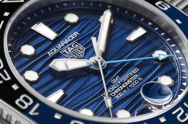 新一代的Aquaracer Professional 300米潛水表面盤上有些比較具體的修改,例如原本面盤的水平飾紋改成像是上一代36mm款式的不規則波浪紋、時針靠近尖端處加了一道線條隔開Super-LumiNova?夜光涂層,這也讓時針頓時看起來有點像品牌的盾形標志,還有就是面盤外圍刻度也經過重新設計,每五個間格改成三角形, 其余刻度則變成粗細和長短一致,同時面盤6點方向的字樣也有些不同,品牌于此增添了“CHRONOMETER”字樣,暗示著手表內部的機芯已經和上一代作品不同。 藍面款的GMT指針配合面盤顏色采用淺藍色,由于上一代是將秒針針尖涂上和整枚GMT指針相同顏色的設計,有可能會造成視讀時的混淆,因此新款特別將秒針針尖改成和時、分針一樣的銀白色,如此一來就更容易看懂所在地時間與原居地時間。