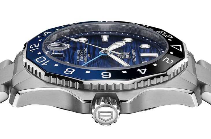 TAG HEUER Aquaracer Professional 300潛水表兩地款一方面承襲之前改款時的特征,例如12邊形陶瓷表圈、旋入式表冠還有底蓋上之前已經更新設計過的潛水頭盔圖案等,同時品牌也調整過手表的「硬件規格」,包括表徑從43mm減為42mm,表殼厚度從超過12mm直接改成整數的12mm,這些外部規格數據看起來不起眼, 但是個中都蘊含品牌考量到人體工學所做出的調整,佩戴在手上的舒適度因而間接提升。 以藍面款為例,手表采用藍、黑雙色陶瓷表圈,讓人可以快速區隔第二地時間的日夜之分,但是制種雙色陶瓷圈設計上一代就已經采用,所以新鮮感并不是特別強烈,反而面盤上有更多值得探究的新元素。