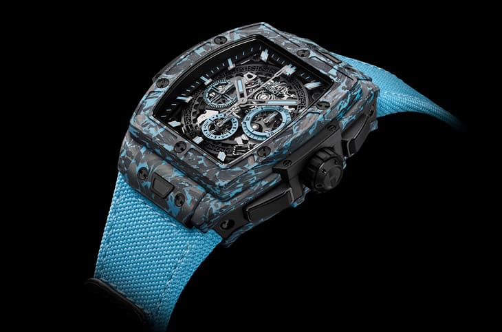 HUBLOT宇舶品牌以其創新精神和科技材質研發而聞名,最新推出的Spirit of Big Bang迷彩藍碳纖維計時碼表,以其獨特的夏日迷彩藍外觀,為炎炎夏日帶來一抹清爽。