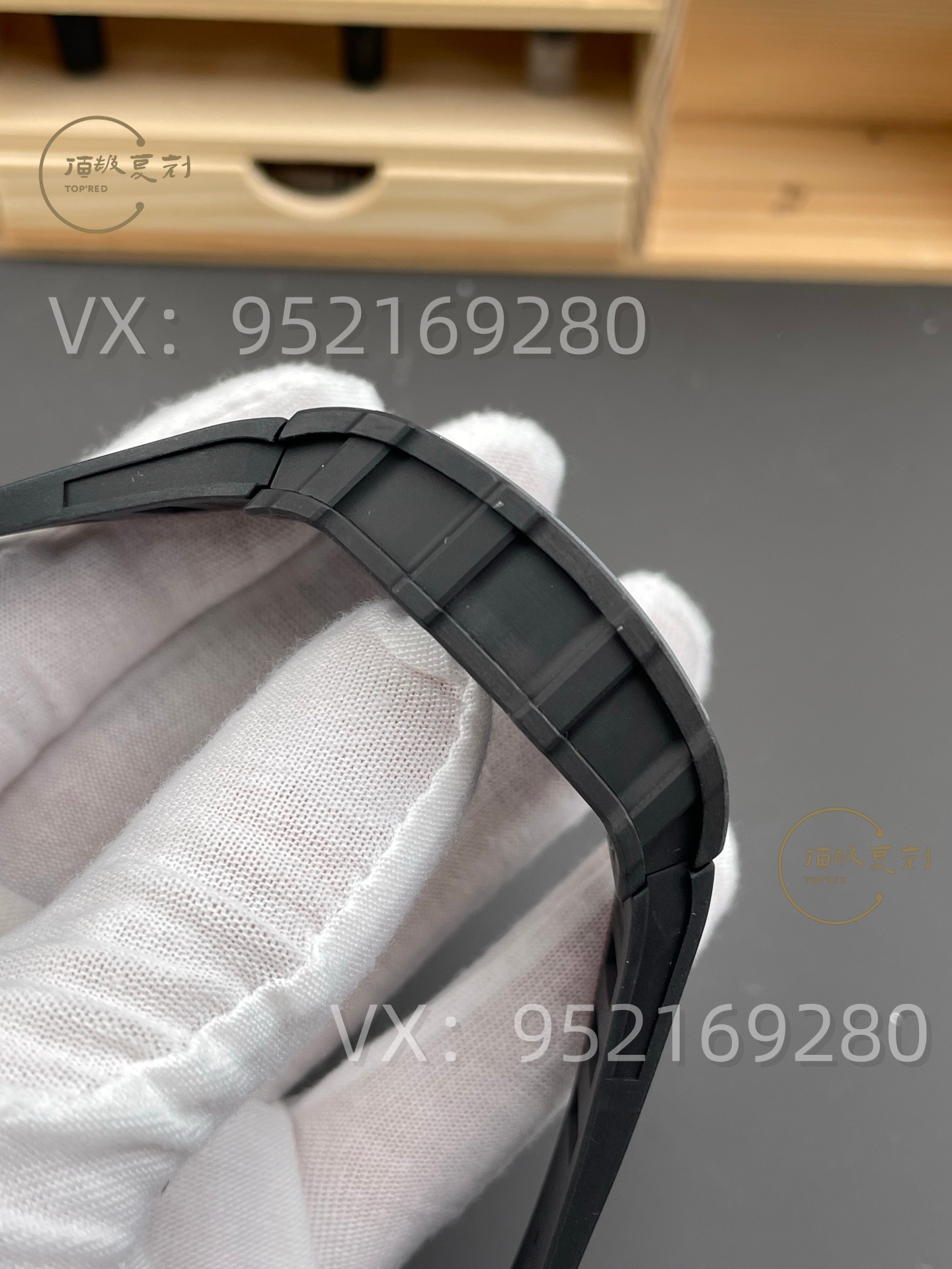 佩戴體驗同樣出色。整表僅重75.5克,輕若無物,搭配原廠浮膠表帶,柔軟貼合手腕,無任何廉價代用膠帶。表扣為鈦金屬材質,與殼身風格統一,開合順滑。夜光填充覆蓋指針與刻度尖端,樣式與原版一致,暗光環境下清晰可辨。41mm左右的表徑雖對小腕圍略顯大氣,但這也正是理查米爾標志性的張揚風格。