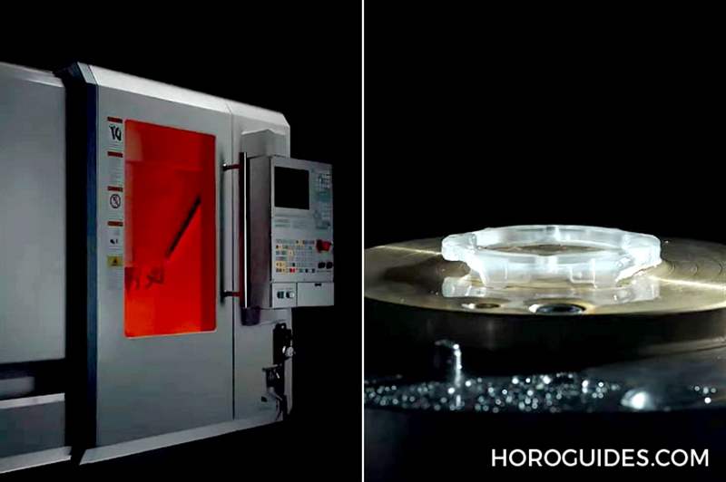 制作一枚藍寶石表殼不僅費時,而且相當花錢!因為藍寶石的硬度僅次于鉆石,也就是說:只有鉆石才能為藍寶石雕塑外型。首先,藍寶石晶柱會以雷射切割成盡可能接近表殼零件大小的薄片,再接著進行基礎的成型。而后續所有成型打磨的機具都必須用上鉆石,例如五軸CNC機臺的鉆頭、以及外觀成型后進行表面拋光的鉆石微粒。