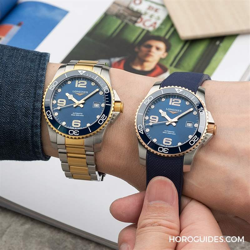 至于黑面與藍(lán)面雖然已經(jīng)是不少人心目中的本命色,不過(guò)浪琴仍然搭出變化,兩色面盤(pán)各自都能選擇金色或是玫瑰金色的PVD細(xì)節(jié),沉穩(wěn)的啞光黑面或是閃動(dòng)金屬光澤的拉絲藍(lán)面,前者是標(biāo)準(zhǔn)的”Go Anywhere, Do Anything Watch”,后者拉絲打磨的光感則是相對(duì)高調(diào)醒目的選擇。