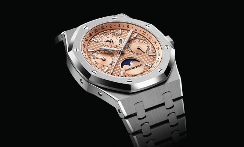 表徑41mm、厚度僅9.5mm的皇家橡樹萬年歷鮭魚面鈦金屬腕表,搭載愛彼自制Calibre 5134機芯,這枚機芯于2015年發表,其設計是從2120型機芯為基礎衍生而來-誕生于1976年的2120機芯,是當前業界生產最久的超薄自動機芯,唯一采用雙向上鏈系統的機芯,可說是一款極具代表性的薄型機芯典范。