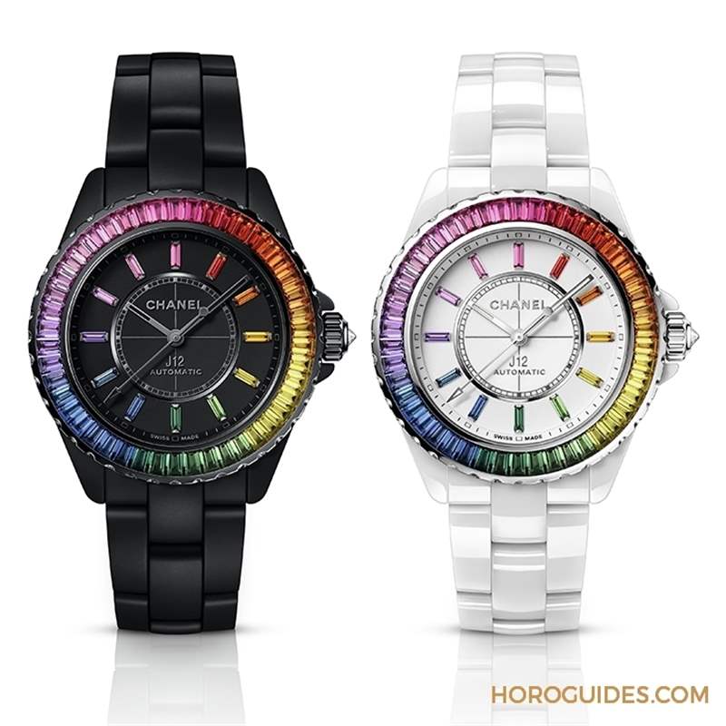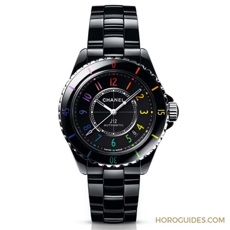 以2019年推出的J12 Caliber 12.1腕表黑色陶瓷款為原型,將表盤上的阿拉伯數字時標與精鋼單向旋轉表圈上的時標,換上12色漸變彩虹新裝,黑與彩色形成的沖突對比,相互烘托點亮彼此,令人聯想起電音的獨有氛圍。此表款共推出表徑38mm與33mm兩種款式,各限量發行1255只。其中,38mm款搭載12.1自動上鏈機械機芯,具備時分秒指示,日期窗位在4時與5時之間;透過藍寶石水晶底蓋可欣賞到以黑色呈現的12.1機芯。33mm款搭載石英機芯,具備時分秒顯示,防水深度200m。