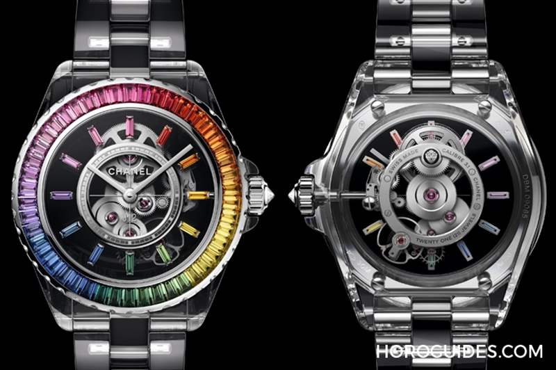 猶然記得CHANEL在2020年打造出抽掉所有顏色的J12 X-Ray,J12不再是黑與白,以藍寶石水晶打造的表盤、表殼以及首見的藍寶石水晶鏈帶,只留下剔透的J12輪廓。2021年,CHANEL把彩虹光譜帶到這款透明純凈的表款,一輪由58顆藍寶石所組成的彩虹圈,取代了J12 X-Ray表圈上原本的鉆石鑲嵌,J12 X Ray Electro Caliber 3.1腕表于焉誕生。