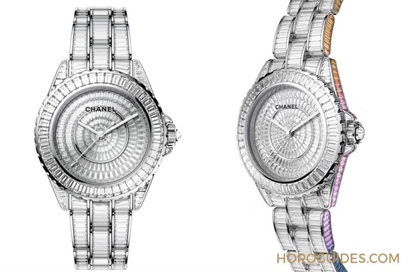 J12 Electro Star的設計也緊扣彩虹這主題,但出現在它身上的那道彩虹,實屬前所未見。CHANEL在18K白金滿鉆鏈帶側邊飾以彩虹色漸變的梯形切割藍寶石,這樣的妝點手筆,不只創造出一道閃耀奪目的銀河,還有一道色澤夢幻的彩虹伴著這道銀河,光芒齊放。