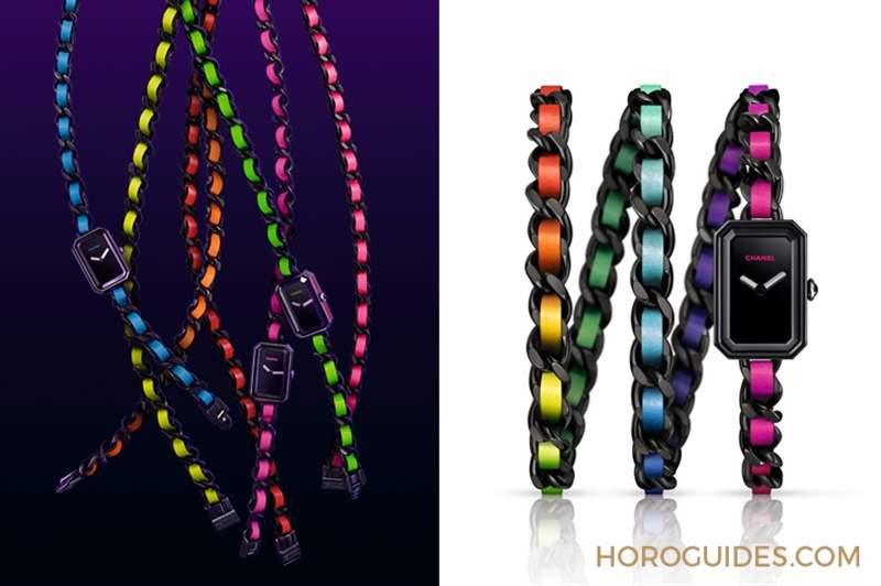 除了將彩虹色調施展在J12表款上,霓虹色調是CHANEL Electro限量系列的另一項重點設計元素。CHANEL歷來首款腕表Première,在這個章回化身為Première Electro腕表,換上了霓虹漸層表鏈,黑漆表盤、黑色ADLC類鉆碳處理精鋼表殼與霓虹色皮革對比出充滿活力的鮮明效果。此外,也以Première為主角打造出Première Box套組腕表,7只腕表,7種霓虹色,并排出多聯畫屏般的搶眼色譜。