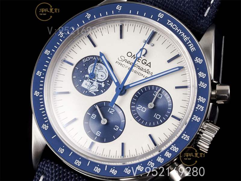 不銹鋼材質(zhì)42mm的尺寸延續(xù)了超霸系列手表的外觀,分量適中很友好,藍(lán)色氧化鋯陶瓷表圈搭配白色琺瑯測(cè)速刻度。面盤延續(xù)了超霸系列的布局,9點(diǎn)位置的藍(lán)色小表盤壓印“史努比”圖案的銀質(zhì)徽章。