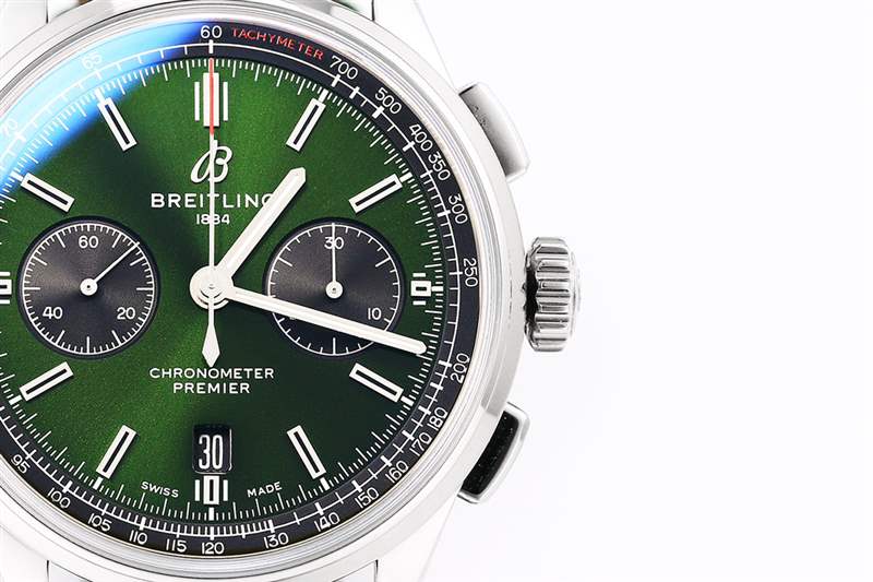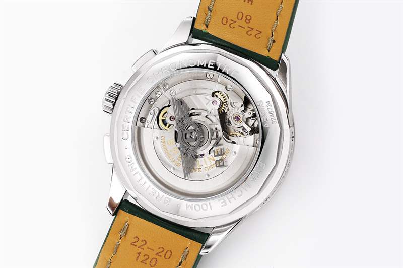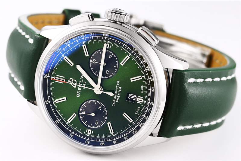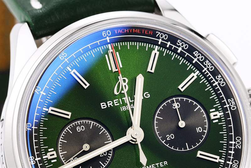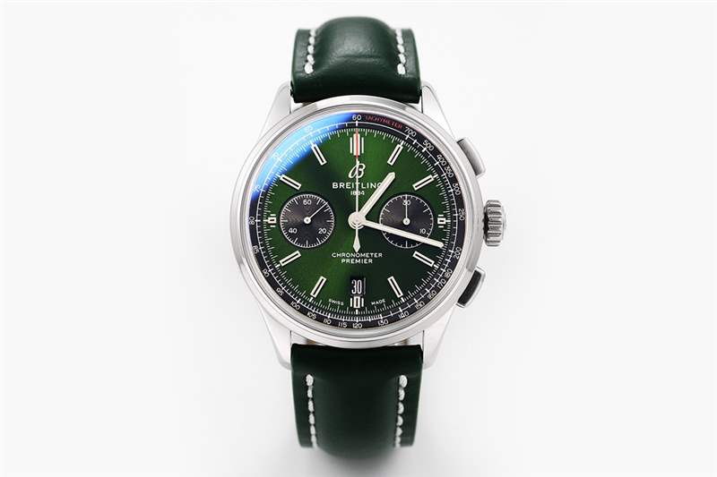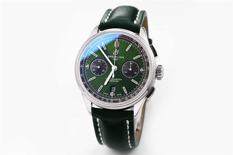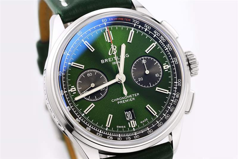 GF廠也是推出了四個顏色的字面,百年靈璞雅系列的風格偏向于優雅運動,這款計時碼表也是,在優雅的運動之間達到平衡!而這一次小白你介紹的這款復刻腕表得到表盤是GF廠還原了正品腕表那醒目亮眼的英國賽車綠作為主色!