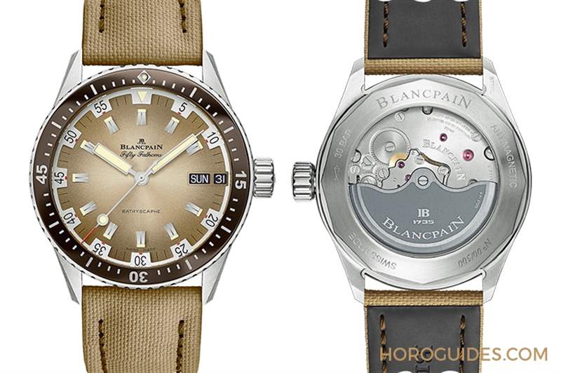 于1970年代問世的Bathyscaphe深潛器系列使用枕形表殼,并以內(nèi)旋表圈取代一般的傳統(tǒng)外轉(zhuǎn)表圈,并在表盤上加入灰色漸變效果。2020年寶珀繼承這種表盤風(fēng)格的深潛器日期及星期腕表,首次將沙漠色的微妙層次化成系列特色,其陰影位置和太陽放射紋的處理賦予腕表非凡的清晰度,而大膽的矩形時標(biāo)則確保了所有訊息的即時可讀性。時分指針涂有Super-LumiNova?夜光物料,并沿用了早期深潛器型號所設(shè)計的棍棒形設(shè)計。單向旋轉(zhuǎn)表圈注入棕色陶瓷制成,并加進(jìn)Liquidmetal?時標(biāo),增強(qiáng)了五十噚深潛器表盤的視覺效果。