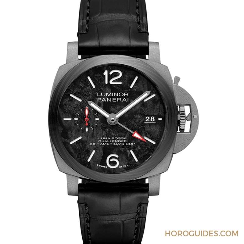 這款腕表的表盤上印制的相關(guān)字樣和鈦金屬表背鐫刻的特制圖案,呼應(yīng)Luna Rossa船隊(duì)特色,如Luna Rossa船隊(duì)與Prada的紅色標(biāo)志,這一標(biāo)志性配色也出現(xiàn)在Luminor Luna Rossa GMT腕表的小秒針和GMT指針末端的三角箭頭上。