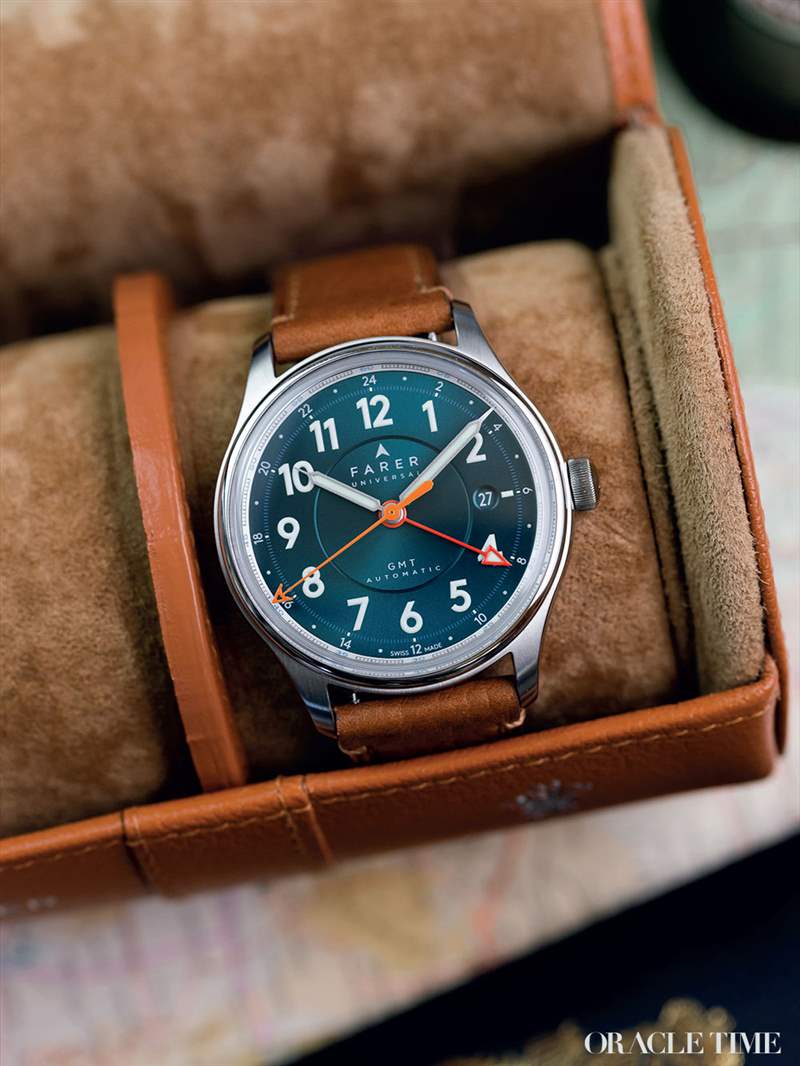 Lander IV 是一款典型的 Farer 手表,經典設計帶有色彩繽紛的英式風格。這正是 Farer 最擅長的。Lander IV 擁有光彩奪目的海綠色表盤,充滿活力和明亮,帶有一絲炫耀的氣息,在這方面類似于英國賽車綠色。細節也非常出色,顯示器具有分層外觀。這種綠色色調與紅色 GMT 指針形成鮮明對比,后者與微妙的外圍 24 小時刻度相結合,以顯示第二時區。此外,它的售價為 1,190 英鎊,是這個價格范圍內最容易買到的產品之一。
