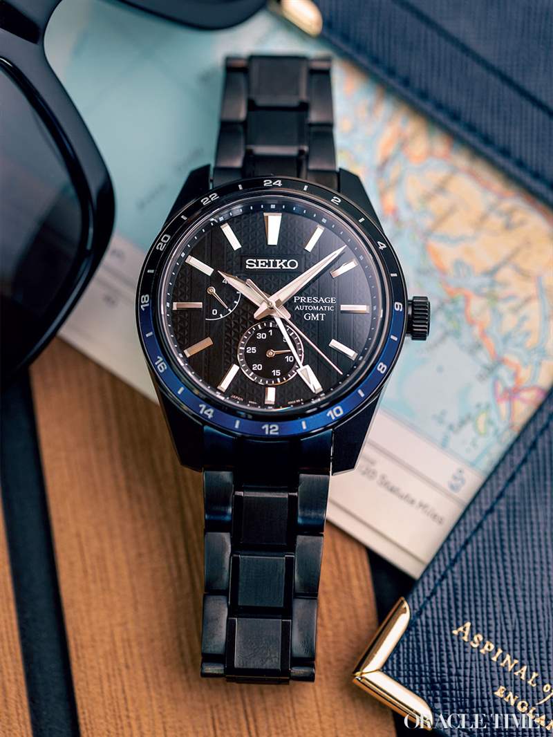 精工 Presage Sharp-Edged GMT 于 2021 年首次亮相,隨后于 2022 年與 Zero Halliburton 合作推出限量版。Zero Halliburton 是一個高級行李箱品牌,以其堅固的箱子而聞名,在紙面上是完美的合作伙伴。在實踐中,它的效果也非常好。行李箱的雙羅紋圖案與 Sharp-Edged 系列的經典麻圖案一起實施。它還首次將 GMT 呈現在時尚的黑色表殼中。