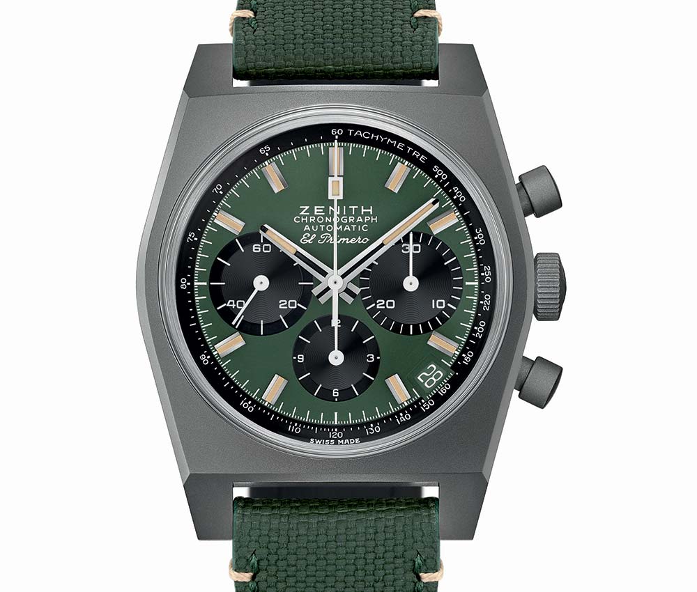 在過去的兩年里,真力時繼續慶祝其El Primero機芯50周年,推出限量版腕表,彰顯20世紀70年代經典精鋼表款的美學和人體工程學。盡管新款Chronomaster Revival Safari的外殼保留了1969年A384參考車的原始37mm直徑,其活塞式按鈕,其材料,鈦合金,堅固而輕巧,但它與所選顏色一樣,具有完全的現代感。因此,它的表盤呈現啞光綠色,具有多種色調,今年非常時尚。計時碼表的計數器和三角分體位置的黑色小秒針在這個表盤上顯得格外醒目。鏤空指針和時標還涂有米色Super-LumiNova?涂層,以確保在任何照明條件下都能獲得最佳易讀性。這種偽裝模式組合由表圈上的測速刻度環繞。