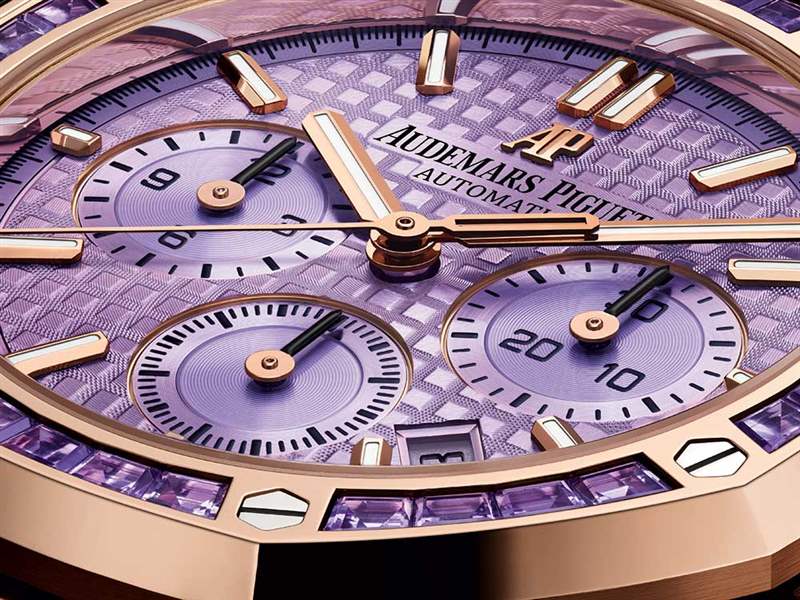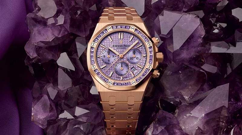 在巖石療法中,紫水晶被認為是一種強大的寶石,具有很強的凈化特性,可以舒緩心靈,平息焦慮,從而有利于夢想,想象力和直覺。除了經過近兩年的大流行后必不可少的有益屬性外,這種礦物還具有無與倫比的光彩,在柔和的淡紫色和強烈的粉紅色之間擺動,有時帶有藍色的暗示,出現在新款Royal Oak自動計時碼表的表圈上,這是愛彼于2019年首次推出的表款。因此,這顆紫水晶內襯著 32 顆約 2.85 克拉的長方形切割紫水晶,每排四顆,中間點綴著著名的平頭螺絲。