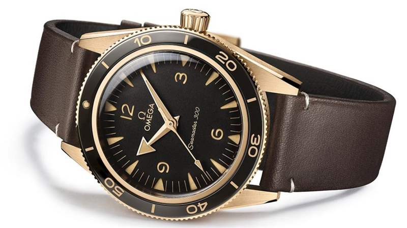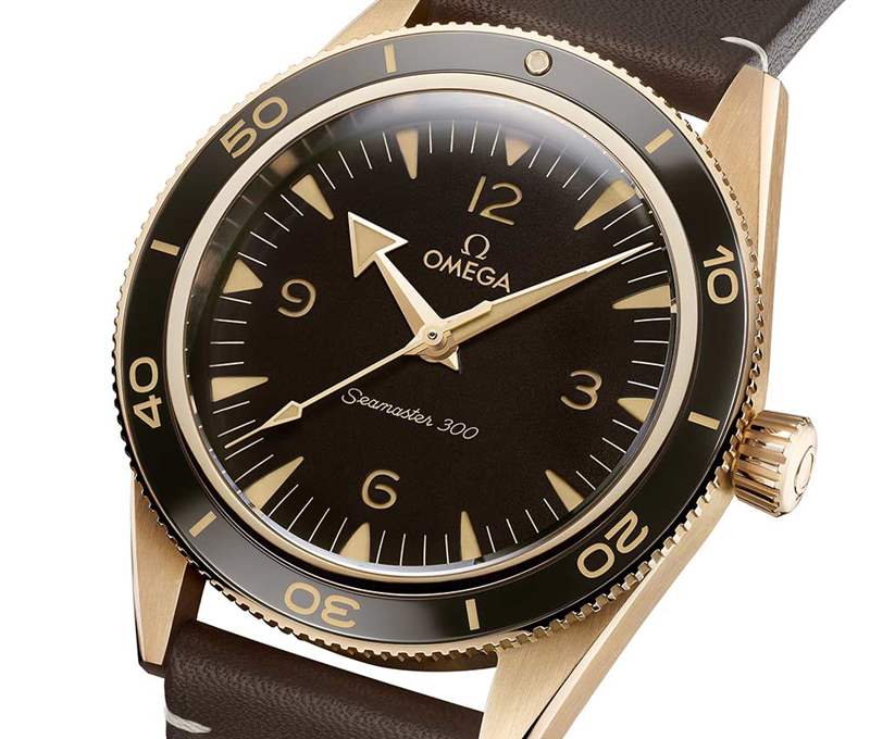 海馬系列300青銅金腕表搭配結(jié)實(shí)的棕色皮革表帶,搭配9K青銅金扣針式表扣。